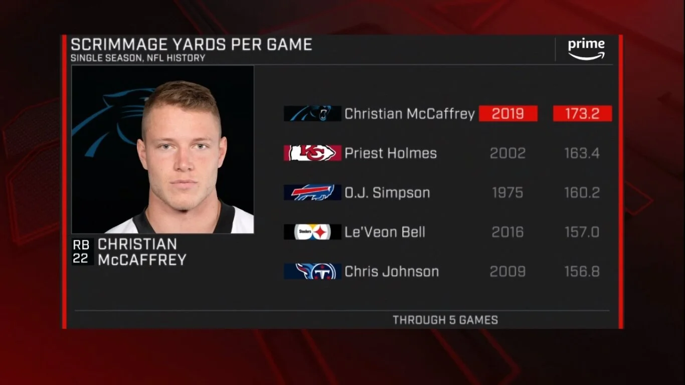 Yeah man, and he looks like a sprinter too. Whatever he’s doing it’s working. He has 866 total yards and the New York Jets’ entire offence only has 718. Granted in one fewer game but that doesn’t take much shine off it. He also has more touchdowns than them as well. I don’t think he’ll get any serious consideration for MVP because a couple of quarterbacks are doing incredible things of their own, Russell Wilson most of all and I’ll come back to him but Patrick Mahomes and Dak Prescott and maybe even Deshaun Watson. But mostly Russell Wilson whose legacy deserves an MVP trophy to fully justify his permanent role in the top four of my Preseason QB ranks. The only worry here is that McCaffrey has been asked to carry an enormous role on this team and those reps tend to catch up with you eventually as the season drags on.