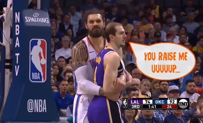 Steven Adams’ name came up in that bit a fair amount. He had himself an eventful game against the Lakers. There was the big old bear hug with Alex Caruso, more on that later, the 10 points in the first quarter, the point in the second quarter when he had to leave the game after getting a knock that left him briefly unable to hear out of one ear… yeah, that was weird.