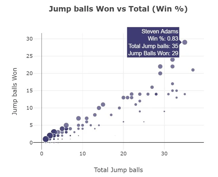 There’s nobody else near him. Here’s what that looks like in number form, ol’ Funaki is winning 83% of these bad boys which is the best mark of anyone with more than three total attempts. 29 out of 35. Keep in mind that there are two guys who compete for each jump ball. One wins it and one loses it so the average success rate is, by definition, 50%. And Adams is at 83%. Bonkers numbers.