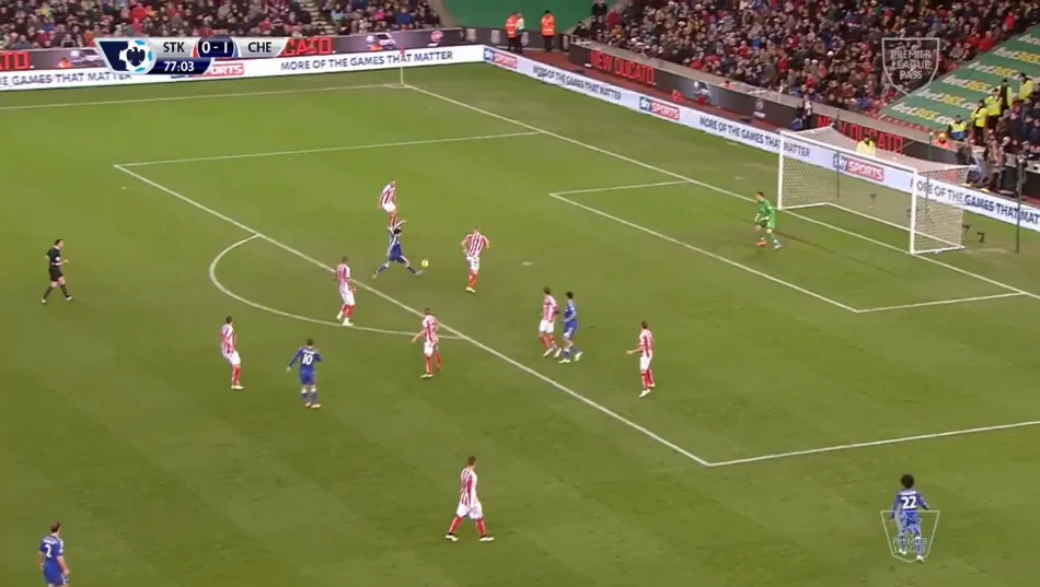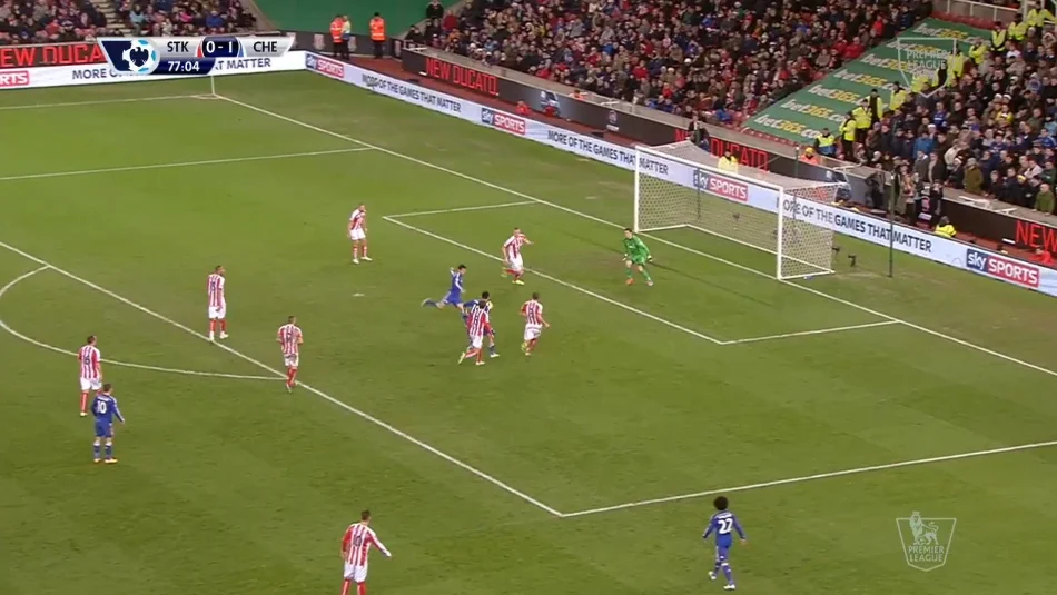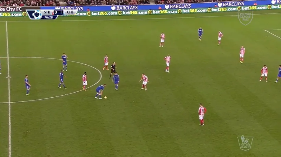 Chelsea then have a 10 pass move, in which no player has the ball more than twice and every player except the keeper and centre-backs touch it. Costa drops deep twice as an option and Hazard drifts from one side of the field to the other and back into the middle to get the ball.