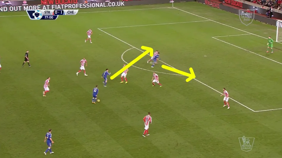 From here Costa makes a simple run across the defence, dragging his marker with him and Fabregas runs into the space created.