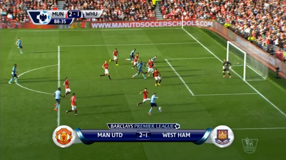 In the 89th minute it looked like West Ham had their equaliser. United were barely clinging on at that point and Kevin Nolan drifted in towards the far post to put the ball in the net… only for the offside flag to pop up. Both Nolan and Fat Sam were livid afterwards, but it seems fairly clear. Make up your own mind: