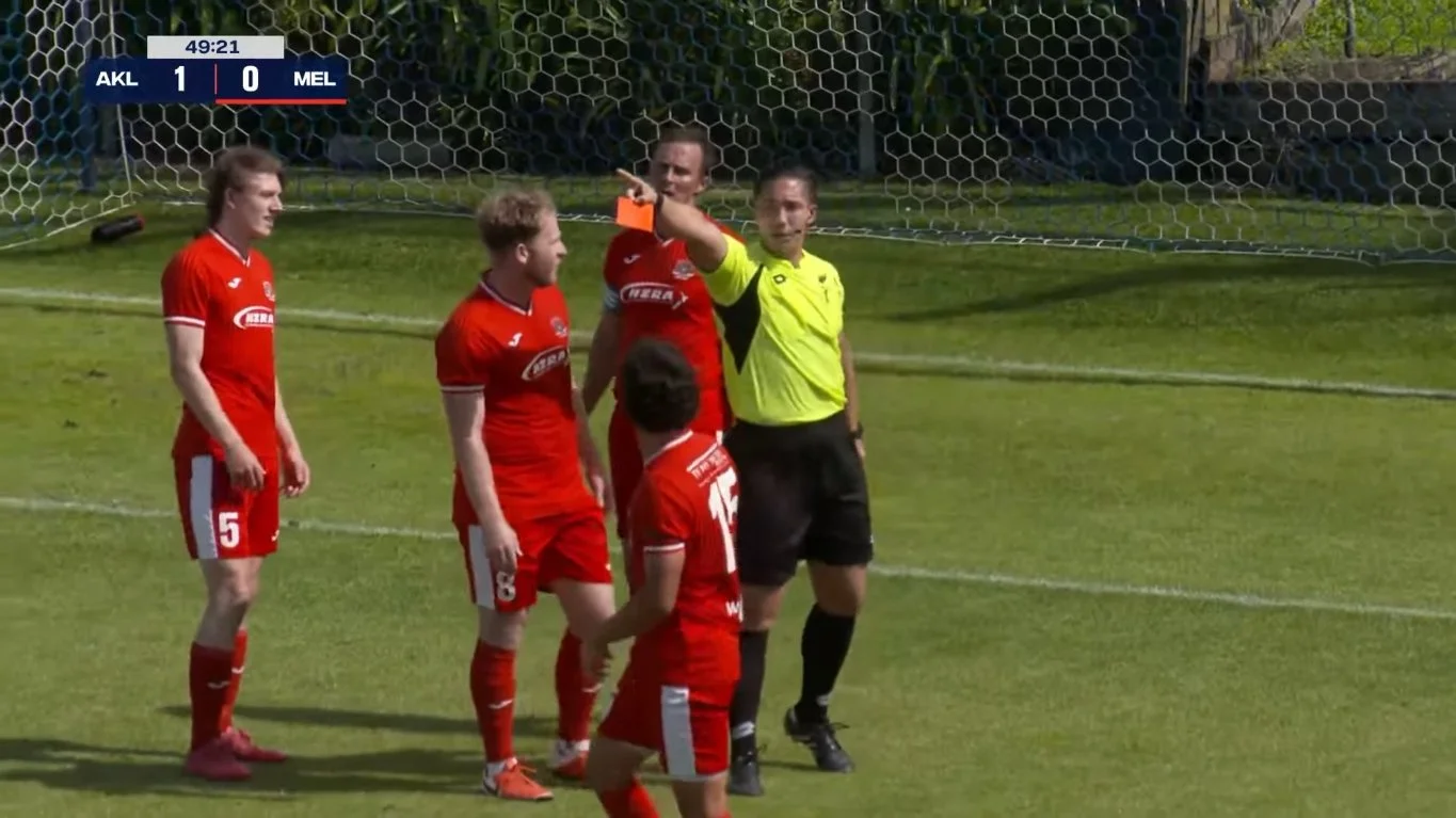 It was shaping up as one of those ‘keep it tight for seventy minutes then give it an almighty swing’ kinda games for Melville... but after 49 minutes they were awoken from that dream by a bucket of ice water to the face. First what happened was that Oakman challenged Iwata on the wraparound into the area and fell over onto the ball, with a penalty awarded for handball. Second thing that happened was that Liam Hayes was given a second yellow for arguing the call. Both yellows for back chat. Quick note for the super outside of the boot touch from RDV to play that ball in behind. It definitely hit the hand of Oakman though it was fully accidental as he fell over. That was unlucky for Melville. The red card less so: Hayes probably ought to have let others do the venting given his existing booking – others such as Max Tommy who was also booked at the same time.