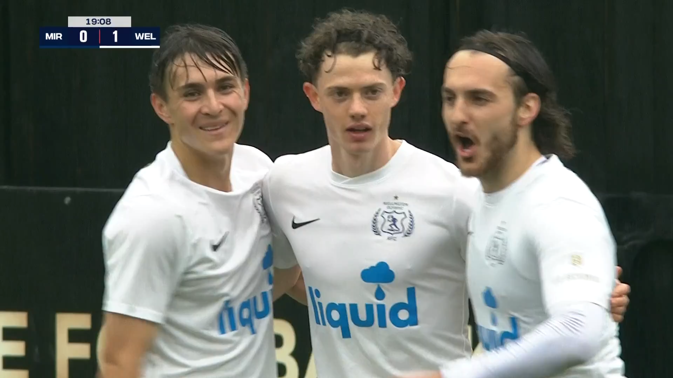 Meanwhile an awkward punch out by Basalaj went directly to his old mate Watto whose first-time shot went off target. Didn’t get the reaction time to fully capitalise but still a useful chance. Miramar settled into a defensive groove that slowed the game down for a bit, a few WO through-balls not finding their targets, but the ceasefire was short-lived. Jonty Roubos smashed a deflected shot wide from outside the box after some sultry build-up. Then on 20’ we saw Gould drift wide and swing one into the area. Tiahn Manuel slid over to break up that delivery but he diverted the ball straight to Jesse Randall who confidently lifted it into the top corner at the near post – the kind of finish that flows on from scoring four times the week before.