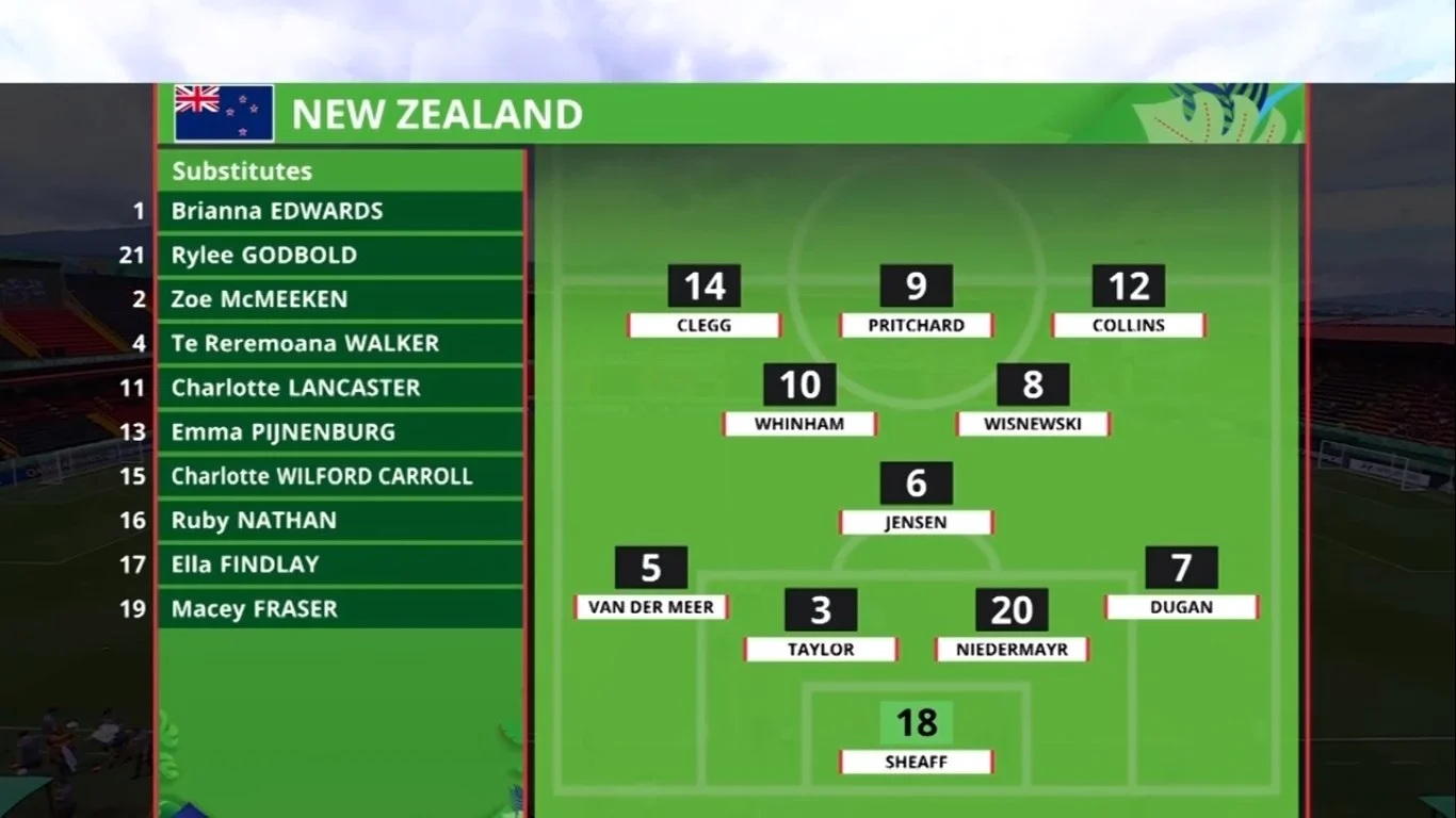 NZ U20s vs Colombia: Murphy Sheaff | Tupelo Dugan, Jana Niedermayr (Te Reremoana Walker 45’), Kate Taylor, Marisa Van Der Meer (Zoe McMeeken 28’) | Grace Wisnewski, Aniela Jensen | Alyssa Whinham (Charlotte Wilford-Carroll 87’) | Ava Pritchard (Ruby Nathan 87’), Milly Clegg (Charlotte Lancaster 64’), Ava Collins