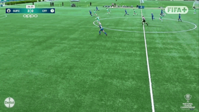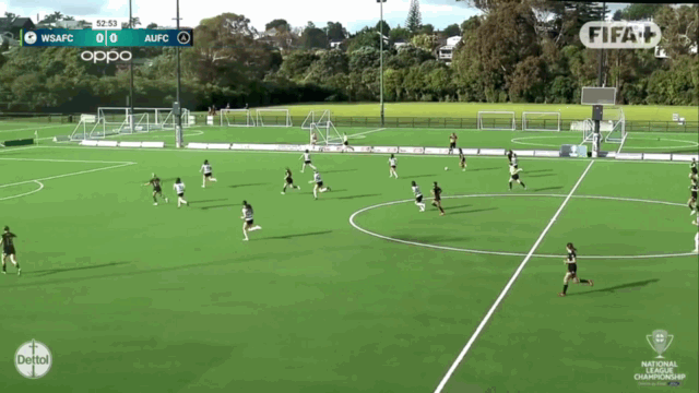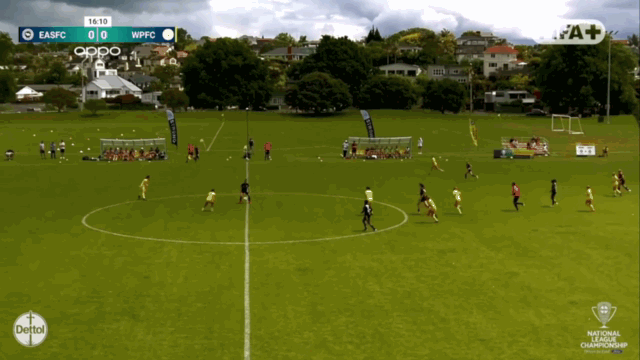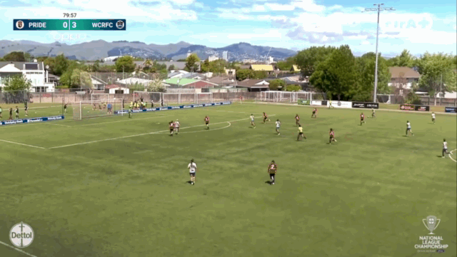 It would be some time before they scored a third though. Petone’s flat 4-4-2 shape (which they’ve used in the tougher games) kept things compact even if they were up against near complete domination. That compactness left space out wide which many teams wouldn’t be able to exploit but with Zoe Barrott and Sarah Alder hitting majestic long diagonals that was no issue for WU. Jenkins let one of those Barrott passes bounce once too often before she lifted her shot off target from a tougher angle than necessary, while Aoife Gallagher-Forbes thwarted her after an amazing through ball from Laskey. With a couple other set piece chances going uncapitalised, Maggie Jenkins could have had a hatty within twenty minutes... at least she did already have two assists. Anyway, the intermission between goals ended just before the break when Sarah Alder did this...