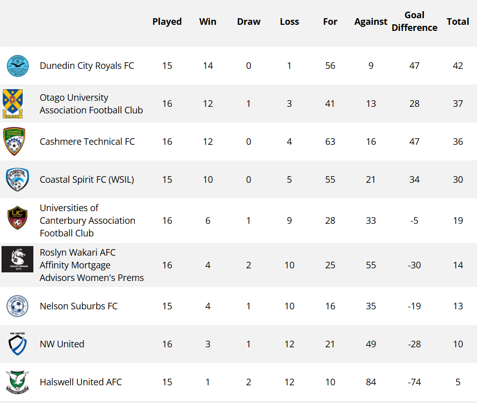 With that problem out of the way, NW United didn’t have to worry about losing 6-0 away to Coastal Spirit. Britney-Lee Cunningham was on form with three second-half goals (52’, 87’, 90’) after Margi Dias (25’, 45’) had done the damage in the first spell. Frankie Morrow also scored along the way (58’). Solid way for Spirit to wrap things up – and the same applies to Otago University who made the trip from one end of the South Island (almost) to the other to face Nelson Suburbs and returned with a 2-0 win thanks to goals from Sofia Zame (42’) and Rosie Hayman (52’). Those were their first goals of the season for each of them. This win for Otago Uni ensures they’ve narrowly managed to avoid the ferocious chase of Cashmere Tech to hold onto second place in the standings.