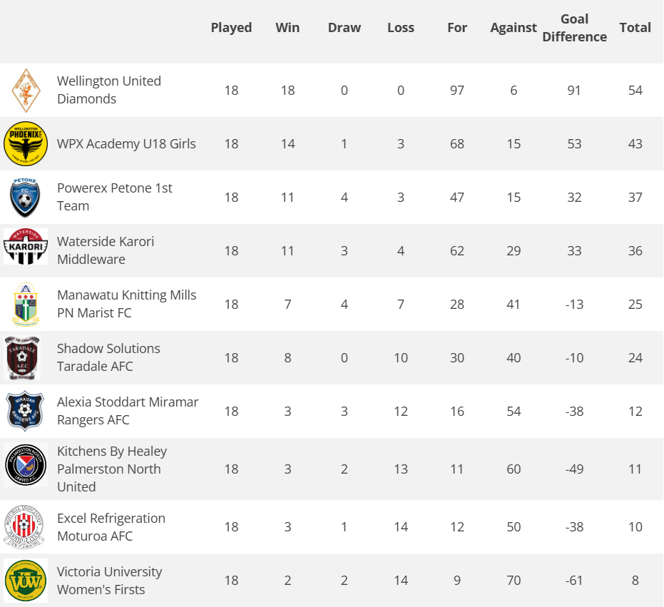 That only leaves the Wellington United quest for perfection. They were away against Miramar Rangers and guess what? They won 8-1. Never in doubt. Summer Laskey scored twice (1’, 35’), Natalie Olson scored twice (45’, 56’). Hannah Pilley scored three times (25’, 75’, 90’). Farina Anchico got one (30’). Somewhere in between all that, Liv Donovan-Grammer briefly made it 1-1 with a 22nd minute strike so it wasn’t a complete washout for Rangers. Even if it had been, they would hardly have been the first to get outshone by the Diamonds this year. 18 wins from 18 games with 97 goals scored and only six conceded. They’ve been streets ahead. Hannah Pilley’s three goals here take her to 16 overall, good for fourth in the comp. First, of course, belongs to Natalie Olson whose brace makes it 35 goals in 16 games. Add in the three she scored in the KS Cup and she might be batting for a half-century when the National League comes around... supposing that Chelsea or Lyon or Kansas City Current haven’t snapped her up on a pro deal by then. Of the ten teams in the Central League, Nat Olson outscored six of them all by herself... and that’s without even counting the assists.