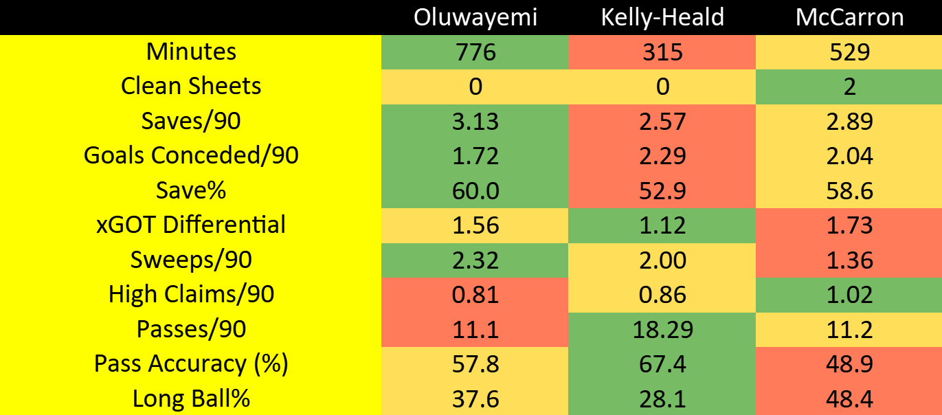 Oluwayemi is the best shot-stopper. The sweeps aren’t his natural game, as he just proved yet again, but he has done a really commendable job of trying to adapt to what the team required. Ruined his xGOT Differential (Expected Goals per Shot on Target versus Actual Goals Conceded) with this performance but the saves still hold up in comparison. Kelly-Heald has conceded a lot, granted while playing the least making his numbers the most volatile, but he makes a massive difference to the team’s ability to build up from the back. His passing game is by far the best of the three which suits the style they were trying to play, especially since Bill Tuiloma arrived with his top notch early-phase passing. And youngblood McCarron settled somewhere in between the two. Only thing was he kicked the ball long way more than the others, with almost half his completed passes travelling 20+ metres, and the xGOT stuff suggests that while he was making more saves than AKH, he was also conceding more than he should have (probably meaning that the saves he was making were easier on average). Dunno if that makes it any easier for the next coach to make a choice but at least the three candidates all offer something unique.