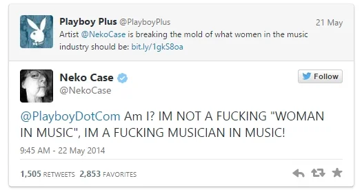 So what’s the difference? The obvious one is that Sleater-Kinney is full of chicks. But saying that their feminine approach is in some way safer (musically or literally) is to spit in the face of their subversive legacy. It’s like Neko Case’s famous tweet last year.
